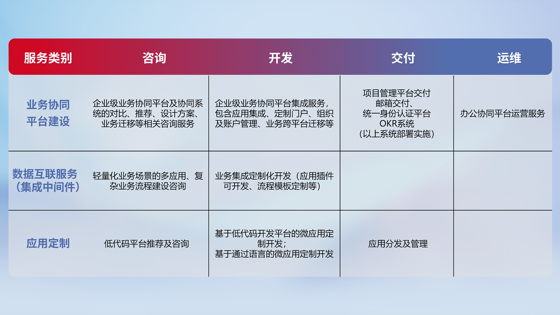 针对钉钉、、、、企微、、IDaas等平台级产品提供产品的规划、、、、方案、、交付、、定制化开发等服务,,,实现如统一协同办公、、、、智能客户服务、、混合会议管理、、、智能数据查询、、、、等业务场景,,,实现数字化转型。。